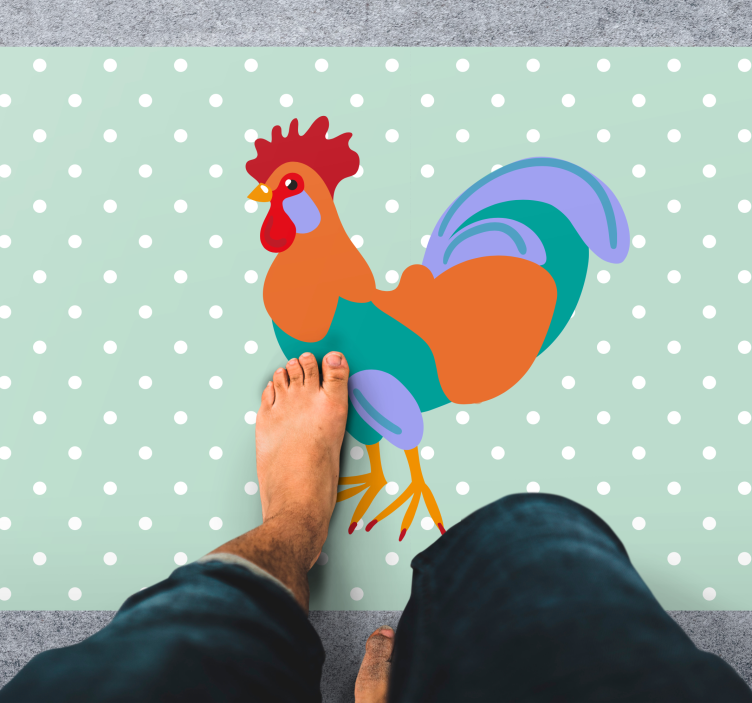 Sumérgete en un mundo de color y alegría con nuestra alfombra vinílica de animales arte del gallo vibrante. Este diseño cautivador presenta un gallo juguetón, cuya ilustración caricaturesca resalta en un patrón de fondo lleno de topos y lunares vibrantes. ¡Es una pieza que transformará cualquier espacio en un lugar lleno de vida y energía!