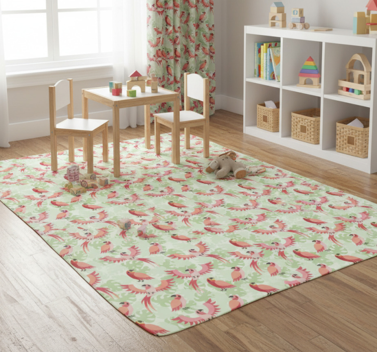 Alfombra vinílica de animales pájaros rojos en hojas verdes