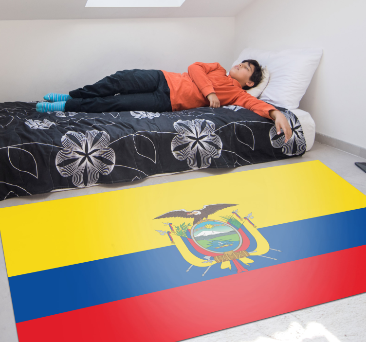 ¿Quieres cambiar la decoración de tu habitación o de cualquier habitación de la casa y no has encontrado nada que te guste? Echa un vistazo a esta alfombra vinílica rectangular que imita la bandera con escudo ecuatoriano. Esta alfombra vinílica para habitación es perfecta para tu dormitorio, sala o comedor.