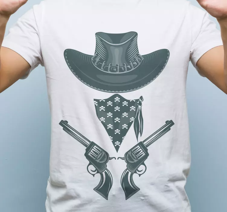 Esta camiseta de hombre es una pieza única de nuestra colección de catálogo de camisetas con diseño de un sombrero de vaquero, pañuelo y revólveres. El producto es original y fácil de limpiar y planchar. Puede elegirlo en el tamaño que mejor se adapte a usted entre los tamaños disponibles.