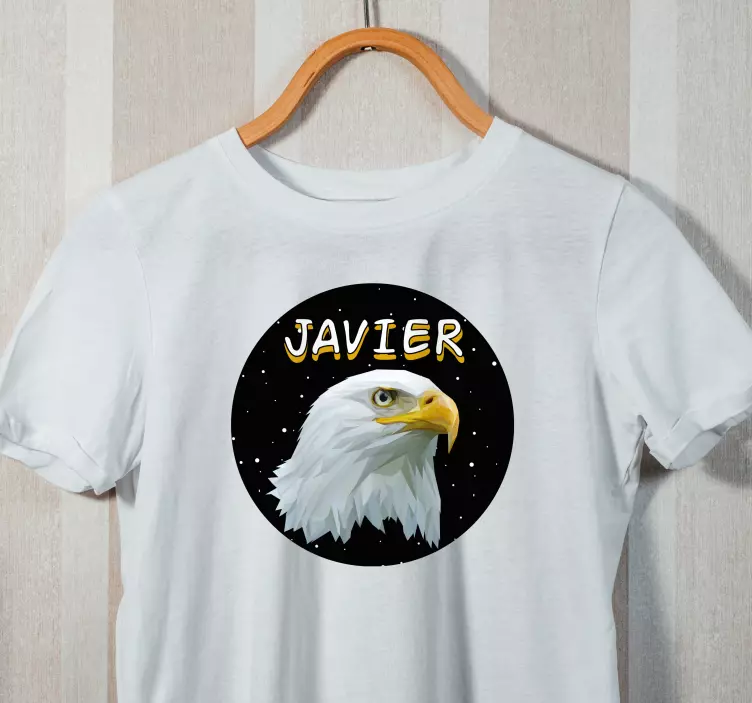 Descubre la camiseta personalizable cabeza de Águila con javier, una prenda única que combina la majestuosidad del águila con un diseño lleno de espíritu aventurero. Este pájaro emblemático, símbolo de libertad y naturaleza, se presenta en un fondo blanco con detalles en amarillo, así como estrellas que enmarcan tu nombre, haciendo de cada camiseta una pieza verdaderamente personalizada.