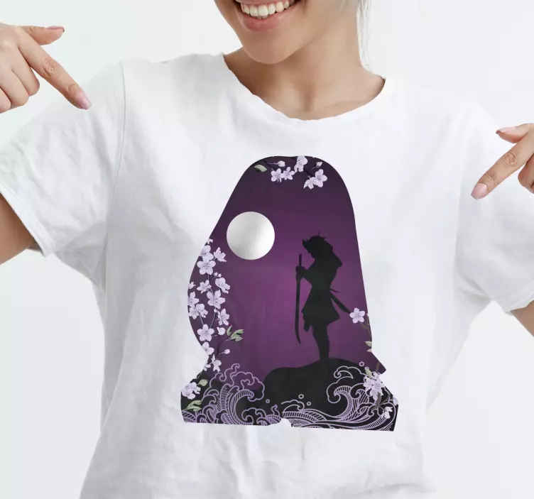 Referencia: T4771Esta pieza elegante presenta la silueta de un guerrero entre flores de cerezo y una luna sobre un vibrante fondo púrpura. Los elementos florales añaden un toque de elegancia, lo que la hace perfecta para individuos expresivos que aprecian el arte en su vestuario.