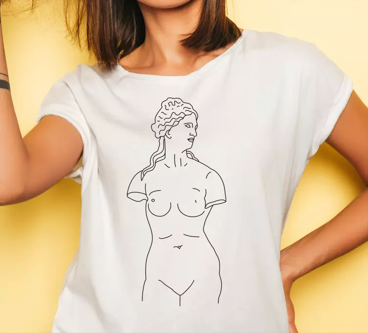 La camiseta silueta femenina elegante destaca por su diseño inspirado en la antigua Grecia, evocando la majestuosidad de una estatua de mujer a través de un arte lineal que fusiona lo cultural con lo moderno. Este retrato abstracto y artístico, con un enfoque minimalista, la convierte en una prenda única dentro del mundo de la moda, perfecta para quienes buscan un estilo distintivo y contemporáneo.