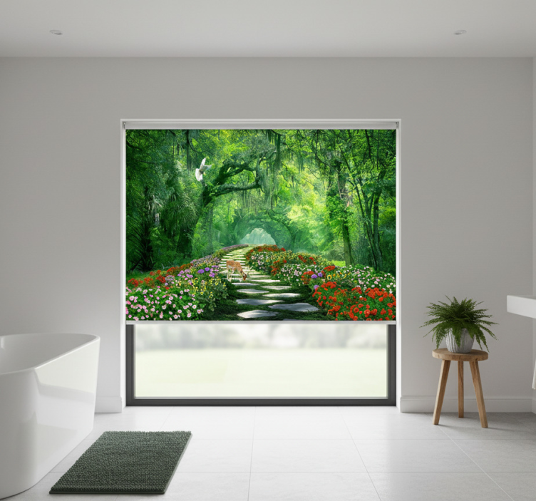 Cortina roller árboles sendero boscoso surrealista