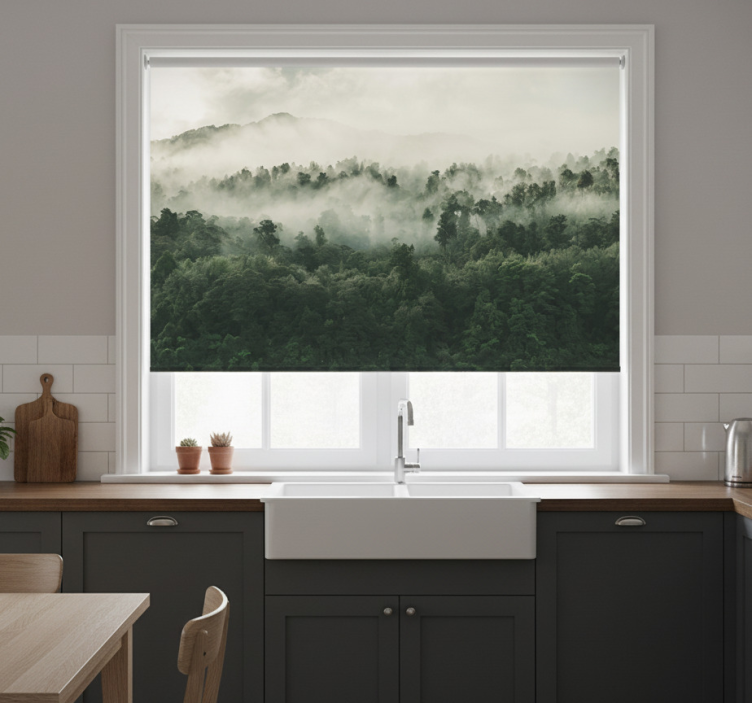 Cortina roller cocina bosque con niebla desde arriba
