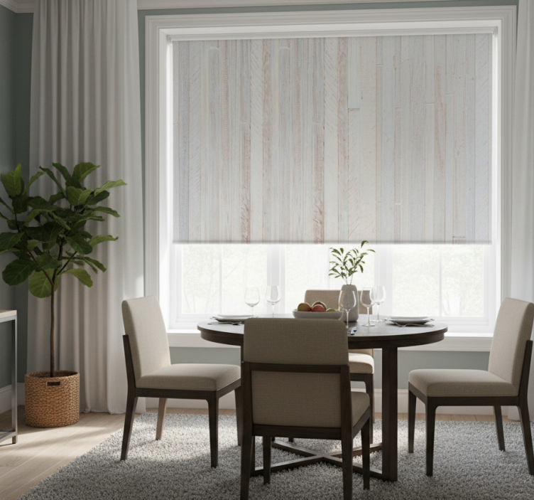 Cortina roller comedor patrón madera gris elegante