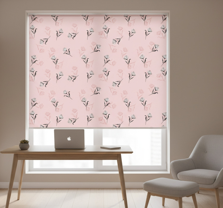 Cortina roller despacho lirios blancos sobre fondo rosa