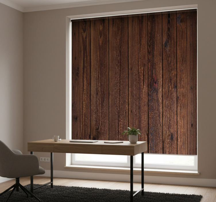 Cortina roller despacho tablones de madera rústica marrón