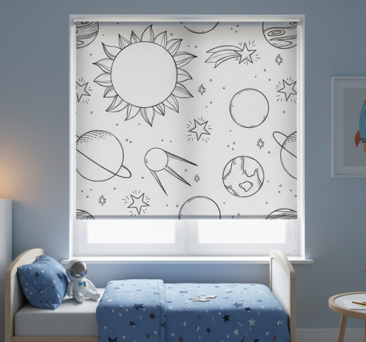 Referencia: E6825Descubre la magia del espacio con nuestra Cortina roller infantil dibujo espacial, que presenta un encantador diseño lleno de planetas, estrellas y cohetes. Esta cortina no solo es un elemento decorativo, sino que también añade un toque divertido y educativo a la habitación de los más pequeños, fomentando su imaginación y curiosidad por el universo.