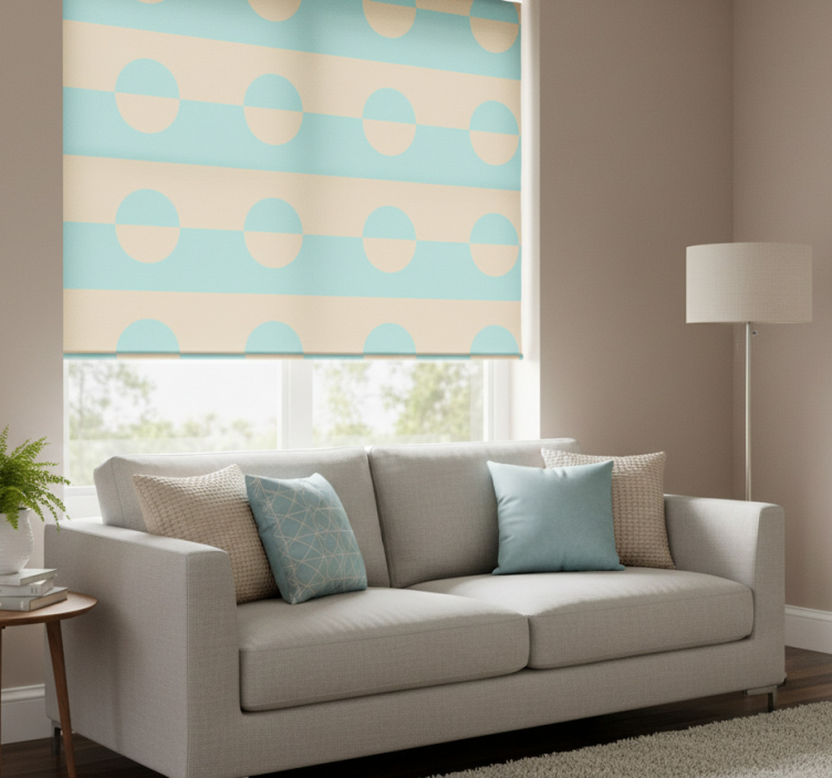 Cortina roller moderno lunares azules y beige cuadrados