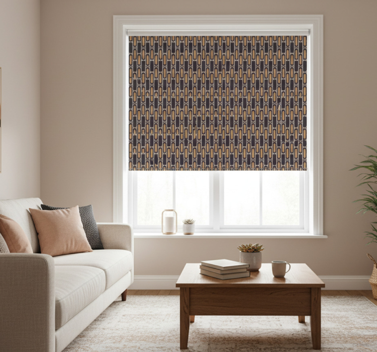 Cortina roller moderno patrón geométrico marrón y rosa