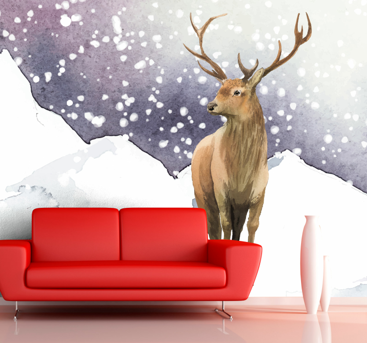 Descubre la belleza de la naturaleza con nuestro Mural de animales escena del ciervo majestuoso. Este impresionante diseño presenta un ciervo elegante en un paisaje invernal, rodeado de nieve y majestuosas montañas. La acuarela utilizada en la imagen aporta un toque artístico, mientras que la fauna silvestre se despliega en un entorno sereno y natural, perfecto para cualquier espacio.
