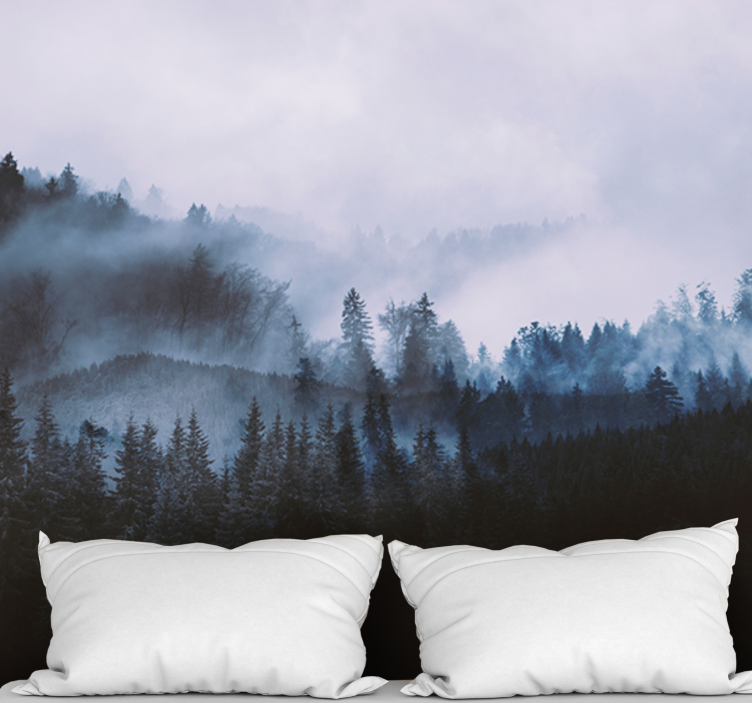 Sumérgete en la serenidad de la naturaleza con nuestro Mural de bosque paisaje de coníferas brumoso, un diseño cautivador que presenta majestuosos árboles, montañas en la distancia, y una suave niebla que abraza los pinos. Este paisaje de hojas perennes y neblina crea una atmósfera tranquila y envolvente, perfecta para transformar cualquier espacio en un refugio de paz y armonía.