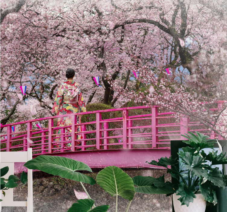 Referencia: F12031Una representación serena de los cerezos en plena floración, enmarcando una figura tradicional sobre un puente rosa. Las delicadas flores rosas crean una atmósfera tranquila, realzada por las coloridas decoraciones a su alrededor, encarnando la belleza de la naturaleza y la cultura.