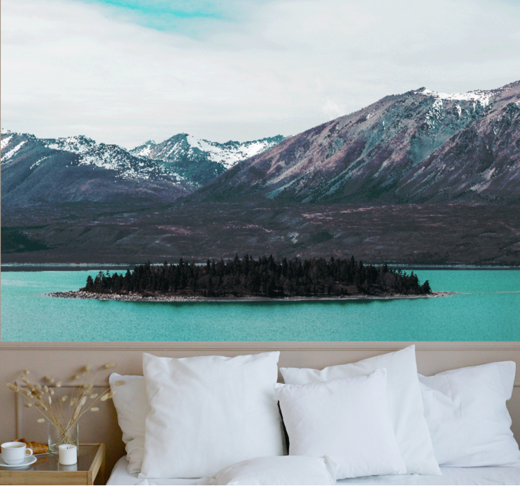 Mural de paisajes lago de montaña con isla