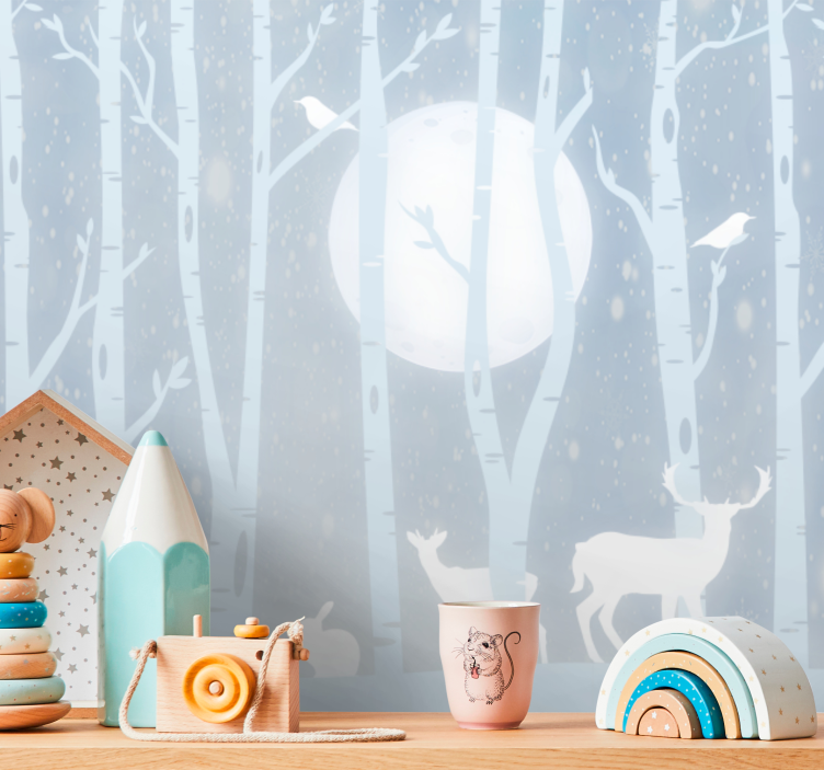 Descubre la magia del mural infantil ciervo y luna, una hermosa ilustración que transporta a los más pequeños a un bosque encantado. Este diseño pintado presenta árboles altos, ciervos juguetones y aves en un ambiente nocturno iluminado por la luna. Su fauna silvestre crea una atmósfera de tranquilidad y asombro, perfecta para la habitación de tus hijos.
