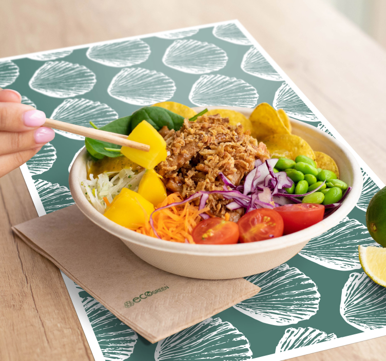 Descubre la belleza del Individual mesa patrón diseño de conchas, un producto que captura la esencia del mar en cada uno de sus detalles. Con un patrón que evoca conchas y formas orgánicas, este dibujo texturizado en tonos verdes transforma cualquier espacio en un rincón inspirado en el océano. Su diseño único combina arte y funcionalidad, creando una atmósfera relajante y acogedora.