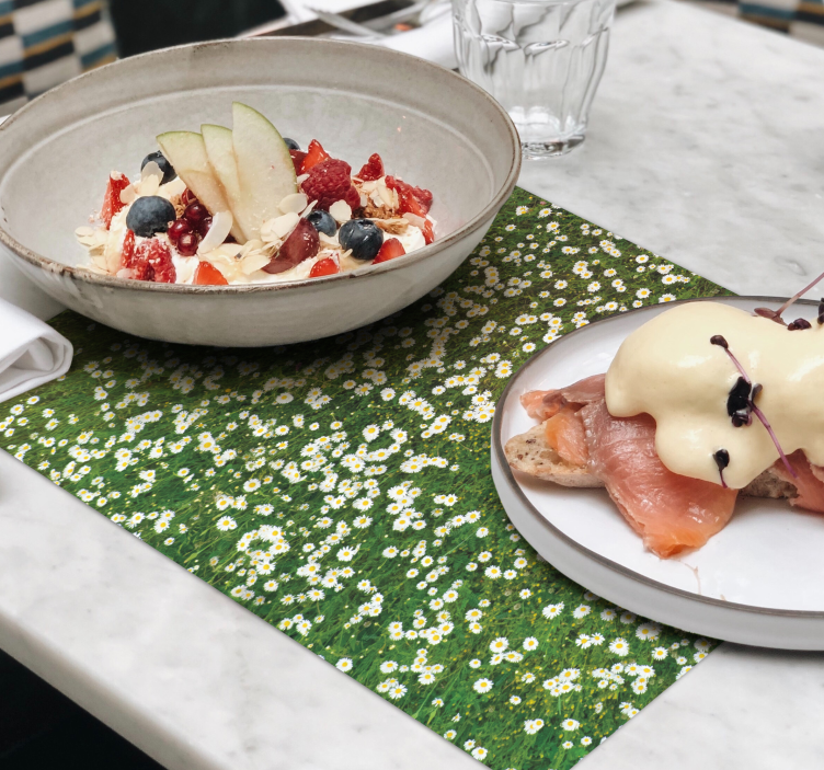 Descubre la belleza natural que trae a tu mesa el Individual mesa patrón flores frescas. Este encantador diseño presenta un hermoso patrón de flores, adornando cada rincón con un aire de jardín y prado. Las margaritas y otros elementos florales en verdes vibrantes evocan la esencia de un campo lleno de vida, haciendo que cada comida sea una celebración de la naturaleza.