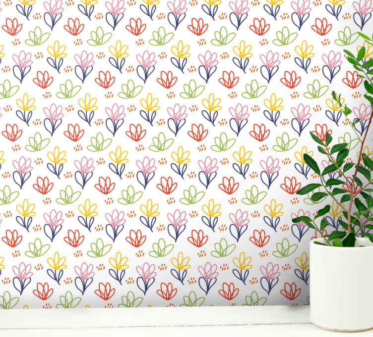 Referencia: P7161Un arreglo multicolor de garabatos florales estilizados. El patrón juguetón presenta una variedad de flores en un diseño repetido, añadiendo un toque vibrante y alegre adecuado para una amplia gama de espacios.