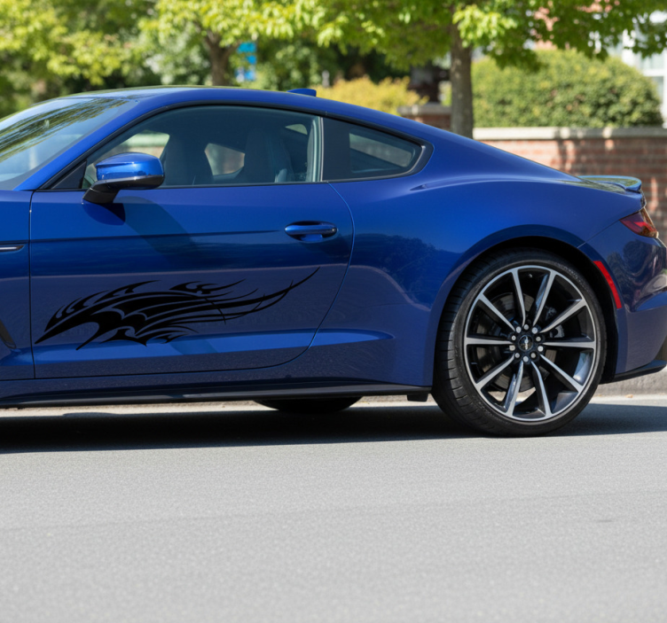 Referencia: A54672Un vehículo elegante presenta un gráfico intrincadamente diseñado en su costado, mejorando su perfil deportivo. El diseño consta de líneas dinámicas y fluidas que sugieren movimiento y velocidad, añadiendo un toque agresivo a la apariencia del coche. Tales diseños a menudo simbolizan poder e individualidad, atrayendo a los entusiastas del automovilismo.
