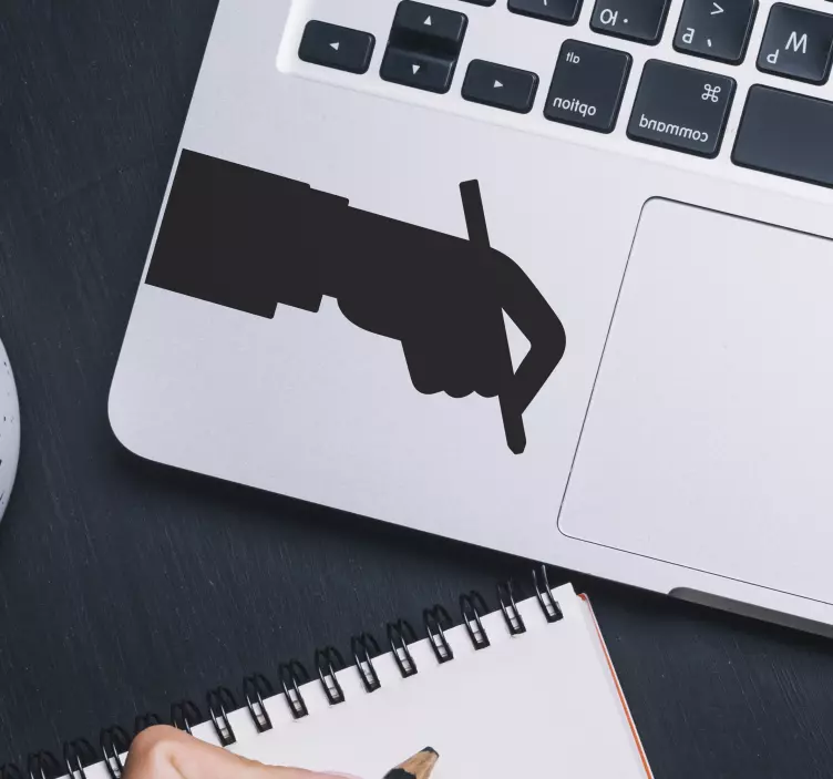 Descubre nuestra Pegatina para portátil mano sosteniendo lápiz, un diseño que captura la esencia de la creatividad. Este gráfico presenta un ordenador portátil en una elegante silueta negra, con una mano que sostiene un lápiz, simbolizando el acto de escribir y crear. Es perfecto para aquellos que buscan un toque artístico y creativo en su espacio de trabajo.