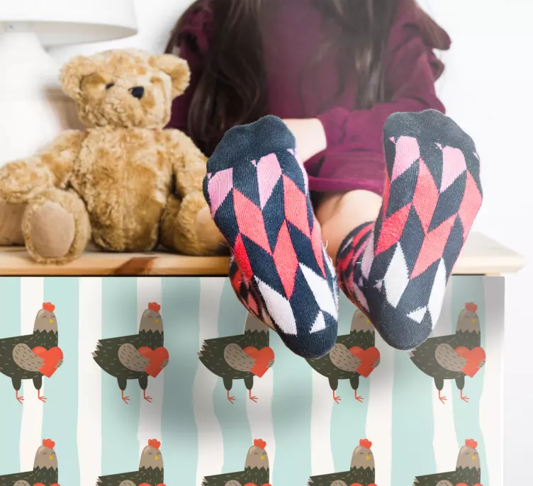 Descubre el encantador vinilo animal de granja patrón de gallinas encantadoras, un diseño que ilumina cualquier espacio. Este hermoso estampado presenta un gallo y gallos en un ambiente festivo rodeado de corazones y rayas, creando un patrón vistoso que recuerda la vida en la granja. Ideal para dar un toque lindo a tus muebles, este vinilo es perfecto para quienes aman los animales y desean un hogar acogedor y lleno de alegría.