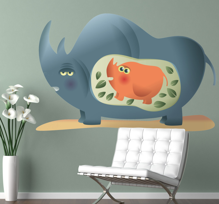 Descubre nuestro Vinilo animal salvaje ilustración de animales juguetones, una obra de arte que captura la esencia de la vida salvaje con un diseño caprichoso y vistoso. En esta ilustración, podrás ver un adorable rinoceronte bebé junto a su mamá, quien está embarazada, todo rodeado de hojas que añaden un toque fresco y vibrante. Los dibujos animados que componen esta escena hacen que la pieza sea no solo decorativa, sino también juguetona y encantadora, perfecta para cualquier espacio.