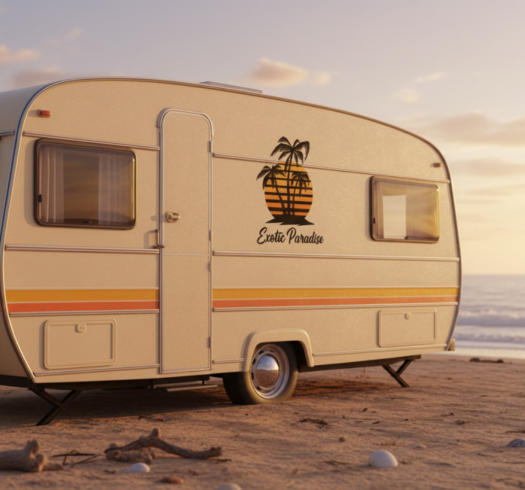 Vinilo autocaravana atardecer en paraíso exótico