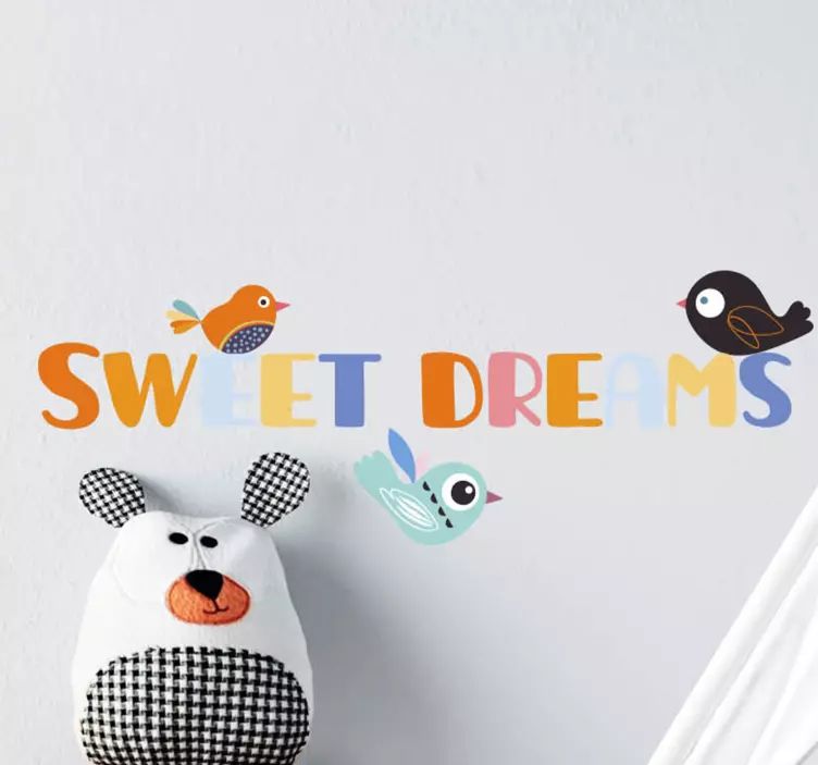 Referencia: A51016Una exhibición vibrante con aves alegres adornando una frase caprichosa que transmite un mensaje de "peaceful slumber". Perfecto para iluminar el espacio de un niño, la combinación de colores y personajes añade un toque juguetón a cualquier habitación.
