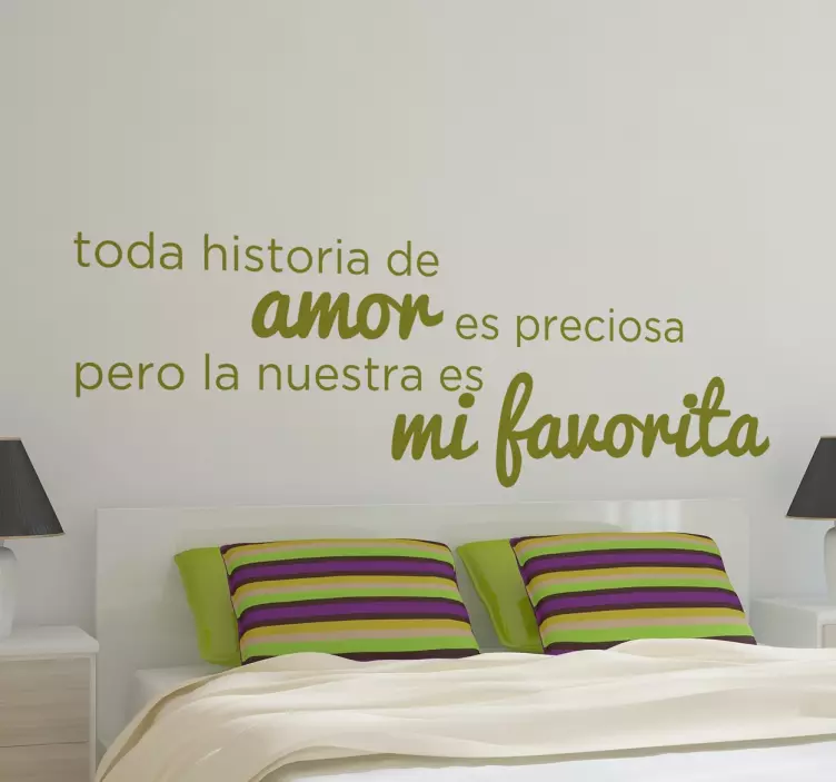 Referencia: A8639Disponible en gran variedad de tamaños y colores, combinará perfectamente con el resto de decoración de la estancia. El vinilo mural incluye la frase "toda historia de amor es preciosa pero la nuestra es mi favorita".