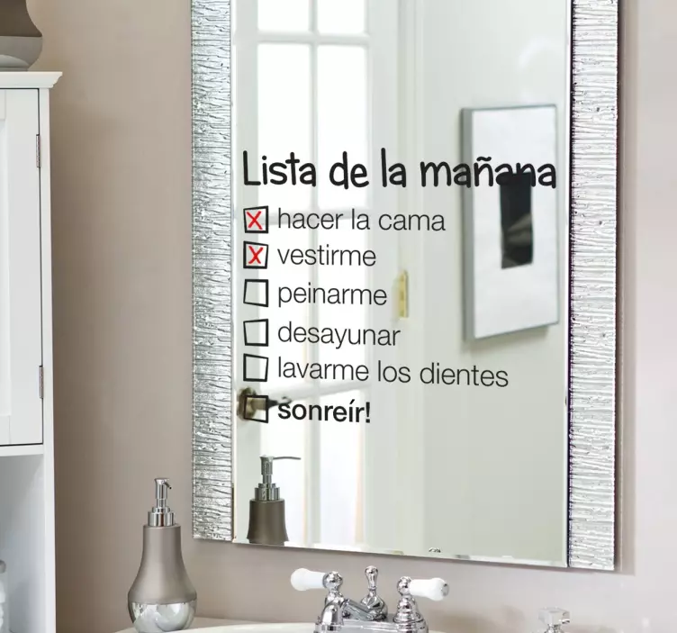 Referencia: A7207Listado de las tareas básicas que debes hacer antes de empezar la jornada. Márcate con una cruz los objetivos que vayas superando como hacer tu cama, vestirte, peinarte, desayunar o lavarte los dientes. Y recuerda algo importantísimo, algo vital para que el día sea mejor: sonreir y ser feliz. Un original vinilo de texto. Elige las medidas y los colores que mejor te vayan y dale un punto de originalidad y diversión a tu aseo.