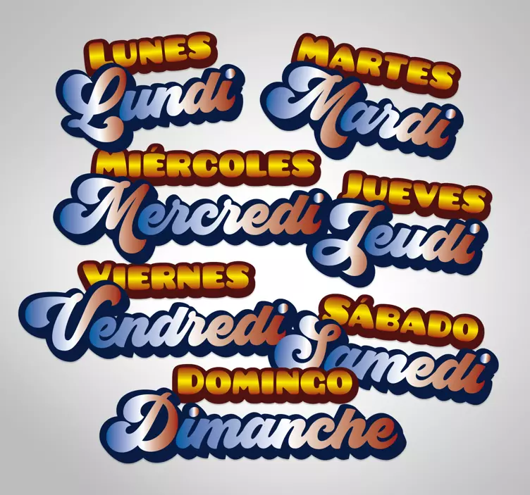 Referencia: A40772Esta colección presenta representaciones textuales vibrantes de los días de la semana en múltiples idiomas. Cada etiqueta muestra un estilo de fuente único y un degradado de color, perfecto para propósitos educativos o decorativos. Ideal para organizar espacios o mejorar un ambiente temático.