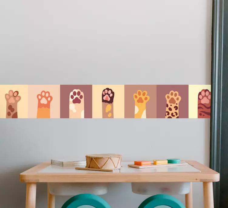 El vinilo huellas alegres de patas es una auténtica obra de arte que transforma cualquier espacio en un lugar divertido y acogedor. Con un diseño que evoca la alegría de las mascotas, este producto presenta un patrón de dibujo animado de patas que se extiende a lo largo de una cenefa colorida, creando una frontera encantadora. Los azulejos de fondo le dan un toque especial, haciendo que cada rincón luzca vistoso y lleno de vida.