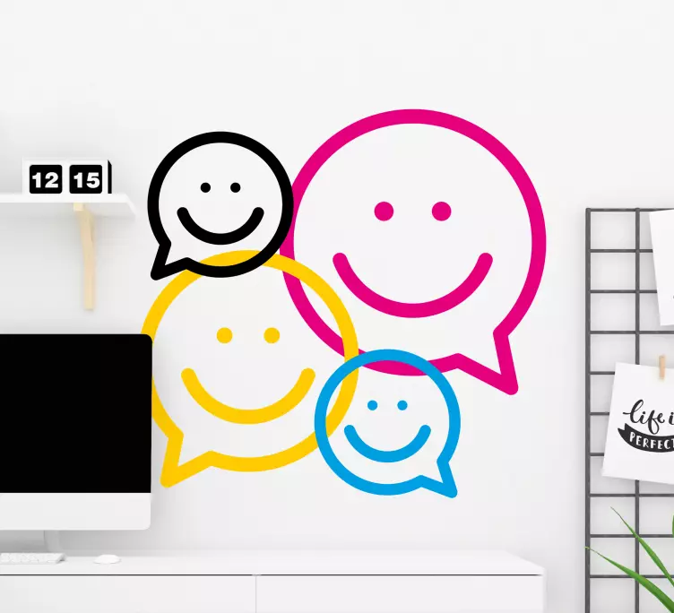 Descubre nuestro Vinilo iconos de caritas sonrientes, un diseño lleno de vida que incorpora burbujas de diálogo y caras sonrientes, ideales para alegrar cualquier espacio. Estos emoticonos vistosos y felices evocan la comunicación en un estilo de dibujos animados, convirtiendo tu entorno en un lugar más ameno y divertido.