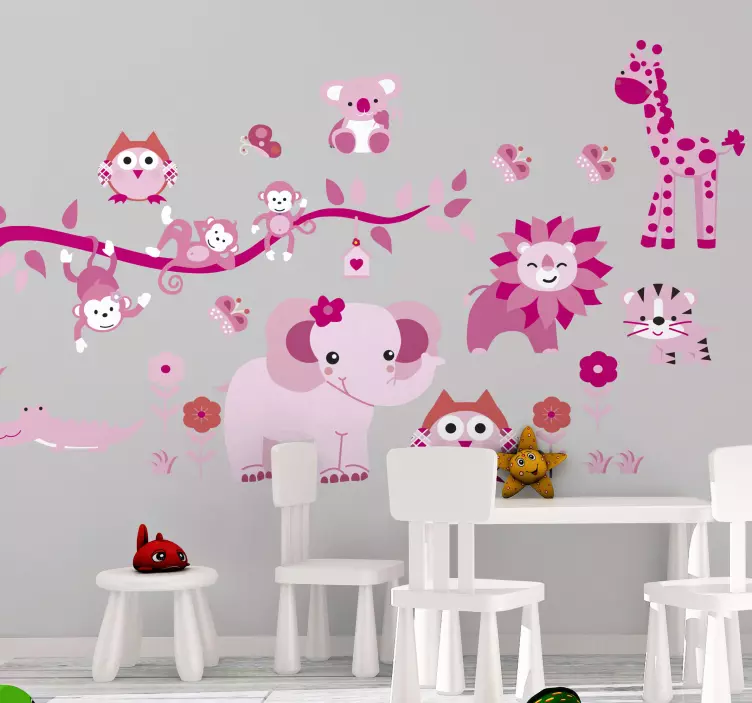 Descubre el encantador vinilo infantil compilación de criaturas adorables, un diseño que transforma cualquier habitación en un mágico mundo de selva. Con sus tonos rosa y rosado, presenta adorables animales de dibujos animados que hacen de este vinilo una opción decorativa y vistosa. Este estilo juguetón y caprichoso atraerá la atención de los más pequeños, convirtiendo su espacio en un lugar lleno de fantasía y diversión.