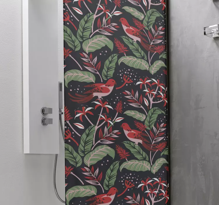 Transforma tu espacio con el Vinilo mampara ducha concepto ave botánica, un diseño vibrante que combina hojas y aves en un patrón floral cautivador. Este estampado, lleno de vida y naturaleza, evoca sensaciones de frescura y armonía. Los tonos verdes y rojos se entrelazan para crear un ambiente acogedor y lleno de energía, perfecto para revitalizar tu baño.