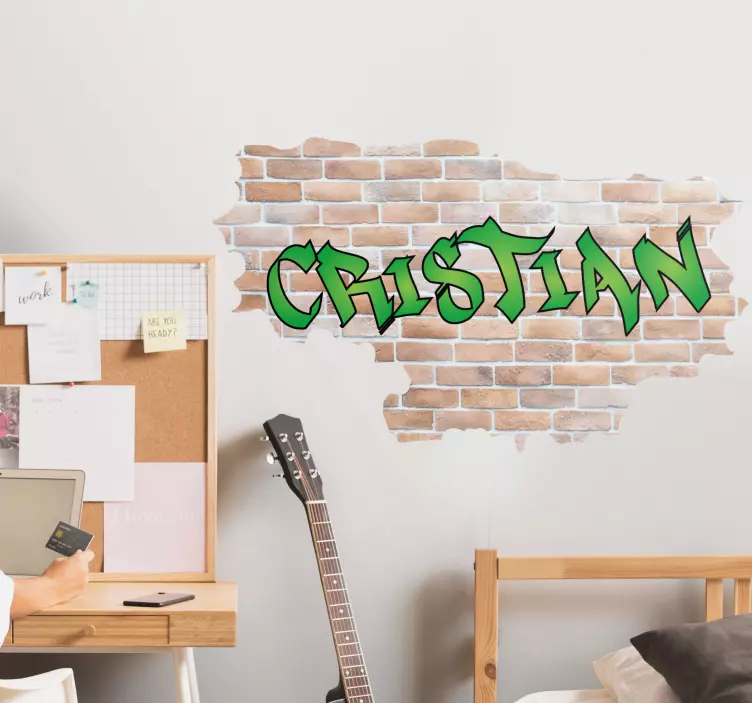 Transforma tus espacios con nuestro vinilo mural urbano personalizado, un diseño vibrante que evoca el arte del graffiti sobre una pared de ladrillo. Este producto es completamente personalizable, permitiéndote incluir tu nombre de manera única, como si estuviera pintada en un mural auténtico. Con tonos verdes y un estilo urbano, cada pieza es una obra de arte que añade carácter y vida a tus ambientes.