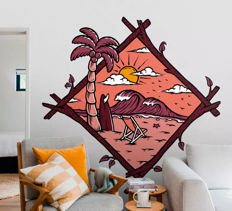 Referencia: A48445Una escena vibrante presenta una palmera contra un fondo de montañas y un sol poniente. Este diseño captura la esencia de una playa serena, invitando a la relajación y la tranquilidad, mientras evoca una sensación de "vacation paradise".