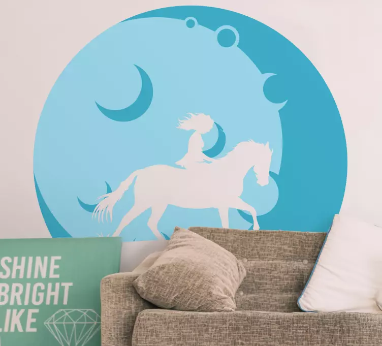 Descubre un encantador vinilo niña montando a caballo que captura la esencia de la naturaleza en un diseño único. La silueta de una muchacha feliz sobre un caballo, rodeada por un hermoso cielo azul y una mágica Luna, crea una atmósfera de aventura y libertad. Perfecto para decorar espacios infantiles, este vinilo es una obra de arte que resalta la alegría de la niñez.
