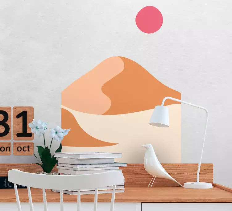 Descubre el hermoso vinilo ornamental dunas de arena abstractas, que presenta una gráfica cautivadora llena de vida. Este diseño combina elementos de montaña y una ilustración abstracta, evocando la serenidad de la naturaleza. Con un sol radiante y suaves dunas de arena, este estilo minimalista añade un toque artístico y relajante a cualquier espacio.