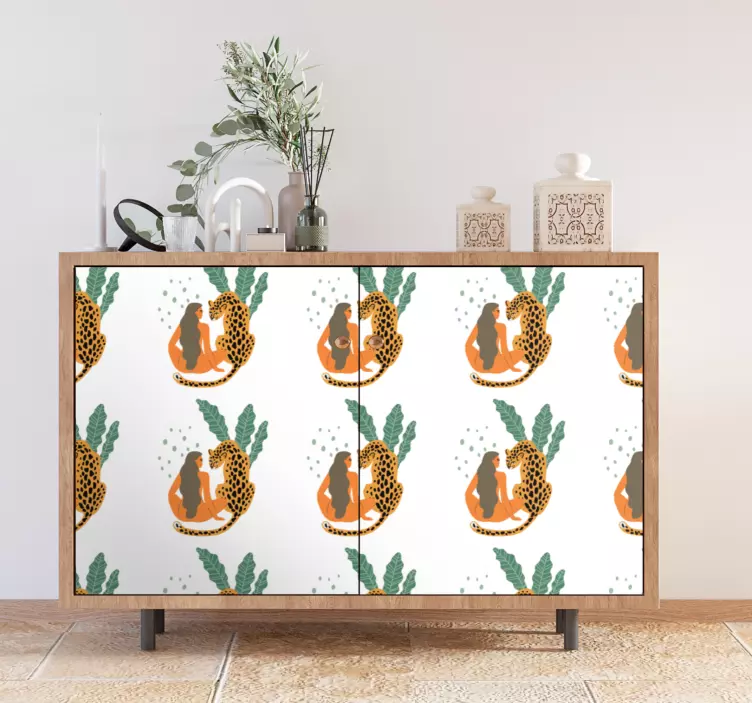 Descubre un mundo vibrante y lleno de vida con nuestro vinilo para mueble escena de plantas con leopardos. Este diseño único presenta una mujer rodeada de encantadores leopardos, todo dibujado a mano con un estilo caprichoso que evoca la naturaleza tropical. Las plantas exuberantes y el motivo animal se entrelazan en un patrón que transforma cualquier mueble en una obra de arte, ideal para aquellos amantes de la naturaleza que desean un toque singular en su hogar.