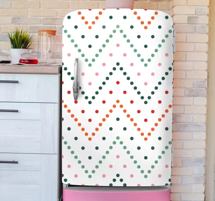 Descubre el Vinilo para nevera motivo chevron vibrante, un diseño gráfico que combina puntos, topos y zig-zag en una explosión de multicolor que transformará tu refrigerador en una obra de arte moderna. Con un estilo vistoso y lleno de energía, este vinilo atraerá todas las miradas en tu cocina. Los lunares y el zigzag dan un toque fresco y alegre, perfecto para aquellos que buscan un cambio audaz en su nevera, frigorífico o heladera.
