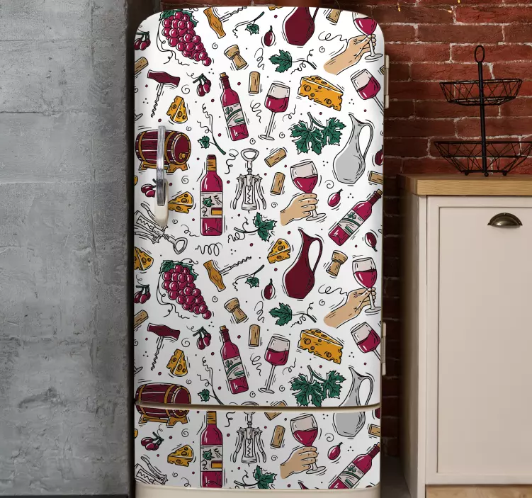 Transforma tu refrigerador en una obra de arte culinaria con nuestro Vinilo para nevera tema de comida y vino. Este diseño cautivador presenta un patrón dibujado a mano que incluye copas de vino, botellas, uvas y queso, creando un ambiente acogedor y gourmet en tu cocina. Cada detalle está pensado para resaltar la belleza de tu nevera y hacer que el momento de abrirla sea aún más especial. ¡Una forma original de dar vida a tu frigorífico!