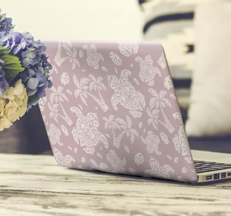 Este diseño está compuesto por tortugas y palmeras sobre un fondo rosa claro liso con pequeños detalles en blanco que le dan un toque tropical a tu portátil. Se trata de un producto de fácil aplicación que se puede quitar en cualquier momento sin dejar residuos ni dañar la superficie de tu portátil.