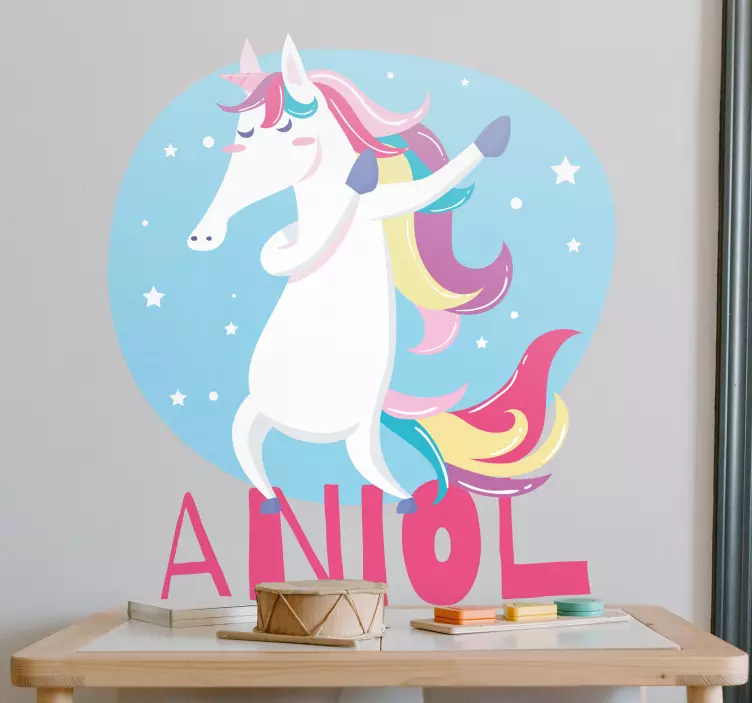 ¡Descubre la magia del vinilo unicornio bailarín colorido! Este encantador diseño representa un unicornio juguetón y caprichoso que iluminará cualquier habitación infantil. Con su estilo fantasioso y vistoso, puedes personalizarlo con el nombre de tu pequeño, convirtiéndolo en una pieza única y especial que hará volar la imaginación de los niños.